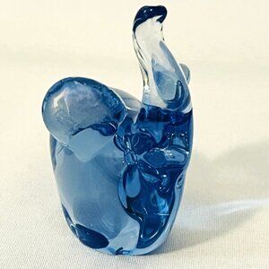 Charming handcrafted blue glass elephant figurine is made with varying shades that create a sense of depth and texture. The elephant is standing with its trunk curled upwards, which is often considered a symbol of good luck. The smooth surface reflects light beautifully, accentuating its curves and contours. Has a smooth bottom.