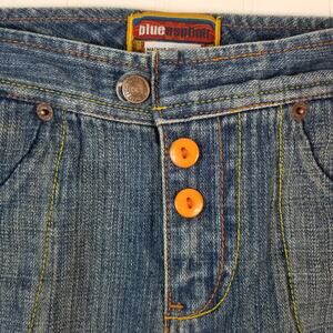 Gently used, no holes tears or snags. Blue Asphalt jean pencil skirt with fabric hem detail. Front split, zip and button front closure.