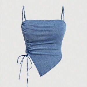 Elevate your style with this chic blue asymmetrical denim top. Perfect for casual outings or a night out, this top offers a unique design with a side tie detail. Pair it with your favorite jeans or skirt for a complete look.