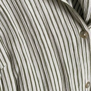 This top is light and airy with sage green and ivory vertical stripes throughout the fabric. Sleeveless button down blouse with a collar. Perfect for the office or professional settings, but also looks great with a pair of jeans and sandals. The top has a few loose threads, but it is in great preloved condition!