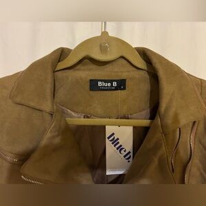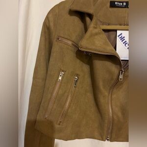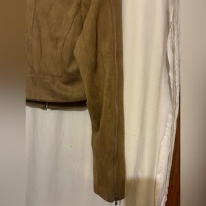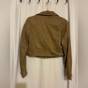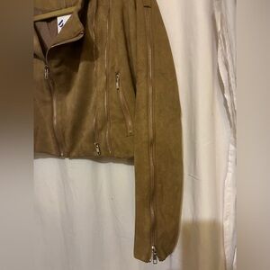 Slightly cropped faux suede zip up moto jacket with zip pockets on each side. Other functional zippers for show. Zippers on arms zip all the way open or closed from shoulder to bottom of arm. Collar and seam down back. Great jacket. I just have to many. NWT. Color is Tan. Size is Small.