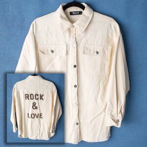 Blue B Collection Women’s Oversize Small “Rock & Love” Cream Denim Jacket Coat - see photos for measurements