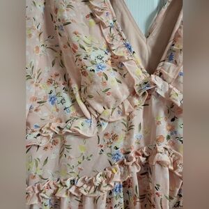 Charming floral dress with ruffle details. Soft pink/peach fabric with colorful floral patterns. Perfect for a casual outing or a special occasion.