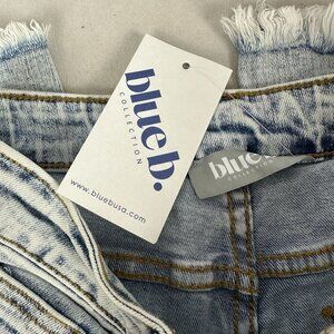 These Blue B jeans feature a stylish high-waisted design with a distinctive fringe embellishment along the pocket. The light wash and raw hem add a modern touch to the classic denim look, making them a versatile addition to your wardrobe.