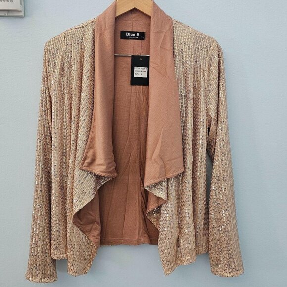 Add a touch of glam to your outfit with this stunning Blue B Sequin Open-Front Jacket. Featuring a shimmering blush-tone sequin overlay, this lightweight layer is perfect for elevating any look. Designed with a relaxed fit and draped lapels, it effortlessly blends elegance with comfort. Whether you're dressing up for a night out or adding sparkle to a casual ensemble, this jacket is the perfect choice.