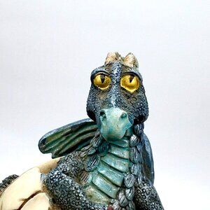 Adorable baby dragon figurine emerging from a cracked egg. Textured scales, golden eyes, and wings give this piece a detailed fantasy look. Perfect for a dragon collection, fairy garden, or fantasy-themed shelf.