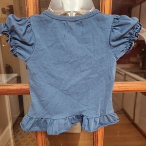 Charming blue baby top with a playful chicken appliqué. Features ruffled sleeves and hem.