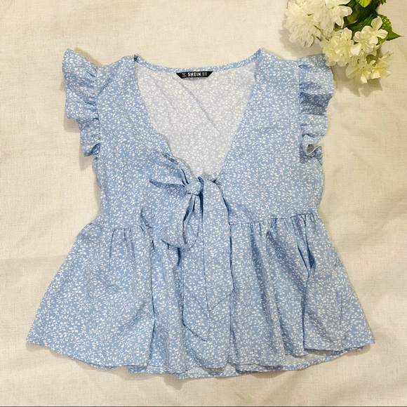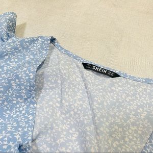 - ruffle sleeves - bow tied in front - blue with white flowers - light and airy