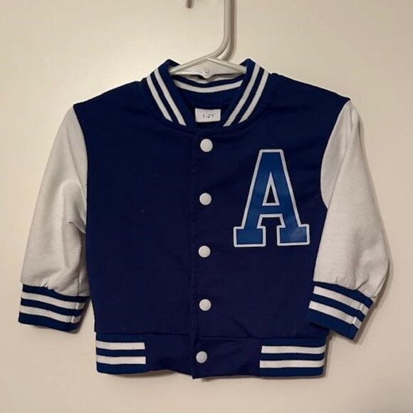 Blue Baseball Jacket, size 1-2 years, "A" on the front