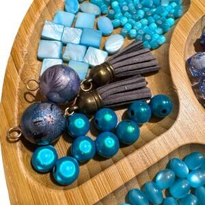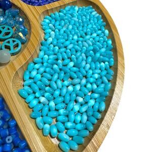 Large mixed lot of blue beads in glass, acrylic, resin, and plastic. Includes faceted glass, peace sign and star charms, seed beads, rondelles, faux gemstone styles, and assorted sizes and shapes. Great for jewelry making, keychains, and crafts. All beads shown are included! All beads have holes. Some are new, some are pre-owned.