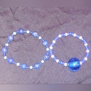This stunning bracelet set features a captivating blend of deep and light blue beads, creating a striking visual contrast. The larger beads boast a glossy, polished surface that reflects light beautifully, while smaller beads add texture and variety. Perfect for adding a touch of elegance to any ensemble. Oversized bead. Size 7 inch paired with size 6 inch Made with stretchy elastic!