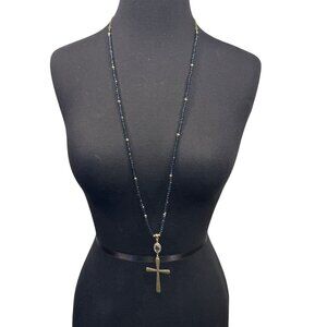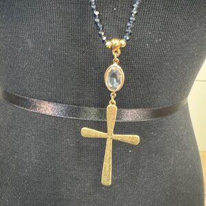 This necklace features navy beaded detailing accentuated by golden spacers and a striking cross pendant finished in antique gold. It has an adjustable lobster clasp chain for ease of wear and fit. The pendant is complemented by a faceted crystal accent for a refined touch.