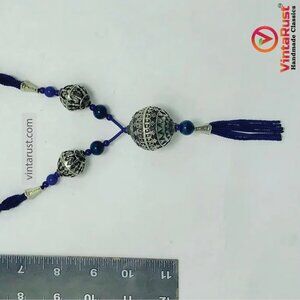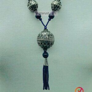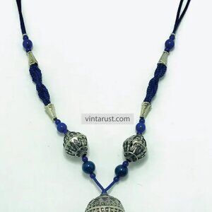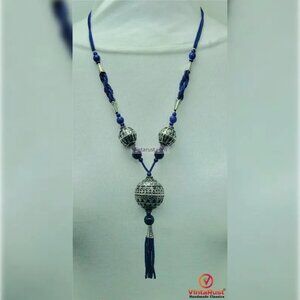 Blue Beaded Pendant Necklace with Silver Tribal Charms and Tassels