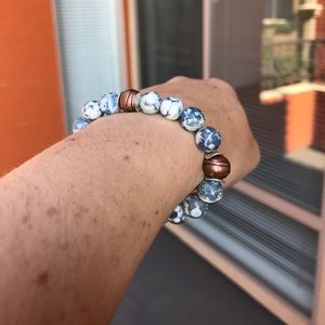 SMOKE/PET FREE. Stretch. Handmade by me. 10mm blue beads with copper beads and silver chips. Fits a 6 - 7 inch wrist (fits 6 inch loose and 7 inch more fitted) *Depending on availability can be sized up or down just leave a comment.