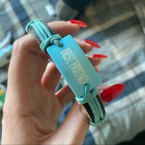 Celebrate your bond with this cute and casual “Best Friend” bracelet! Featuring a vibrant blue plate with bold white lettering and matching braided cord, this piece makes a thoughtful gift for your BFF—or a fun addition to your own accessory collection.
