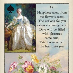 The Blue Bird Lenormand deck has an updated design with elegant, classic artwork. The 38-card deck now has extra Gentleman and Lady cards. It features playing card inserts and verses by Stuart Kaplan to assist the reader in interpreting the card meanings. The 40-page instruction booklet includes a brief biography of Mlle. Lenormand and card meanings.