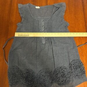 Chic tank top with ruffled sleeves. Features button accents and floral hem design. Stylish and versatile.
