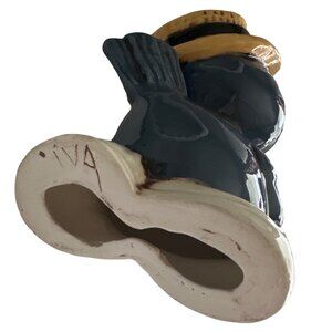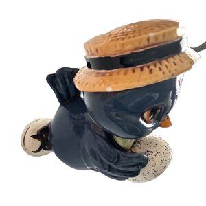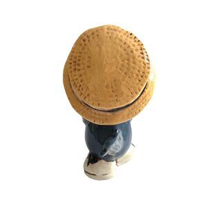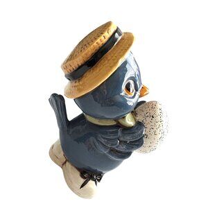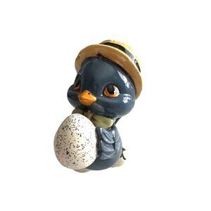 This Blue Bird Vintage Ceramic Figurine is a small, part of a set collectible featuring a blue bird in a straw hat and bow tie, offering a speckled blue Easter egg. It stands 5.5” tall.