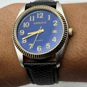 Blue & Black Men's Watch it Fully functional with brand new batteries. Adjustable band fits 6 1/2 in wrist or near. Has a day window.