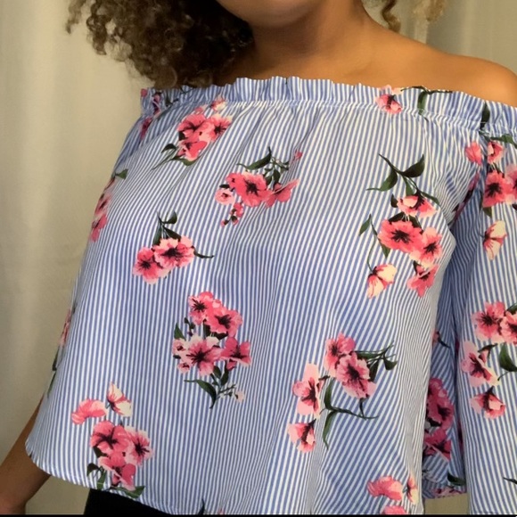 Super cute blue blouse with pink flowers! Sleeves go halfway down your arm. Can fit s/m/l