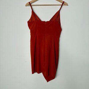 Blue Blush burnt orange cocktail dress. Asymmetrical, longer on left side. Cinched on side. Spaghetti straps. It might look more dark brown or red in the photos but it reads more of a rust/burnt orange color.