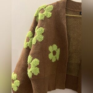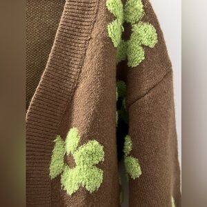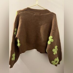 Stay cozy and stylish with this brown sweater featuring vibrant green floral patterns. Perfect for layering and all seasons!