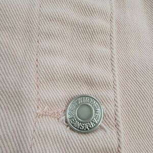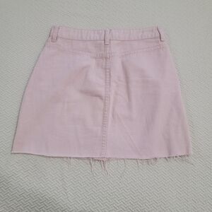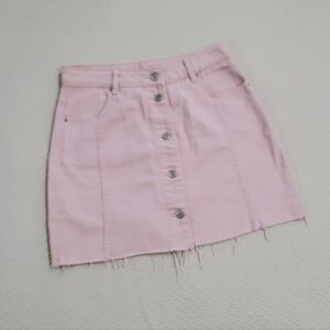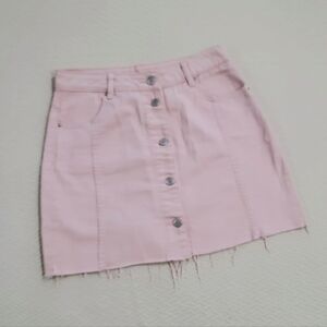 Light dusty pink cotton denim mini skirt. Button Front. Frayed bottom hem. Two front pockets. Belt loops.