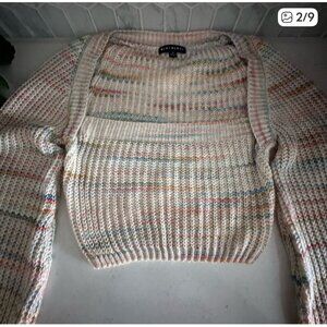 A stylish cropped sweater from Blue Blush, featuring a multicolor knit pattern and balloon sleeves. This medium-sized garment offers both comfort and a modern aesthetic, making it a versatile addition to any wardrobe. Suitable for transitional seasons, it pairs well with high-waisted pants or skirts for an effortlessly chic look.