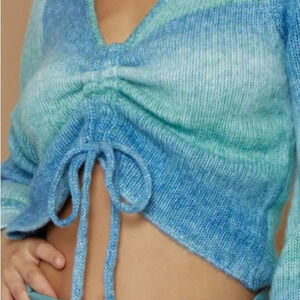 Blue Blush women’s cropped knit sweater in a dreamy blue-green ombre. Features a ruched drawstring front detail, v-neckline, and balloon sleeves for a flattering mermaid-core look. Perfect Y2K revival piece that works for festivals, coastal vibes, or layering with high-waisted jeans and skirts. Excellent preowned condition. From a smoke-free home. Fast shipping!