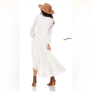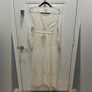 The dress comes in two sizes, Small/Medium and Medium/Large, ensuring a perfect fit for sizes 2 to 10. The long sleeves provide coverage while still maintaining a feminine and flowy silhouette. The natural color of the dress adds to its charm, making it versatile for any occasion.