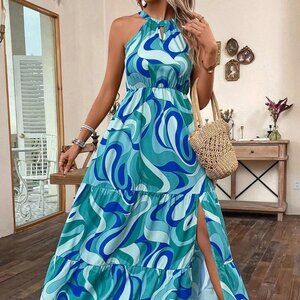 Blue Boho Womens Allover Print Split Thigh Ruffle Hem Halter Dress