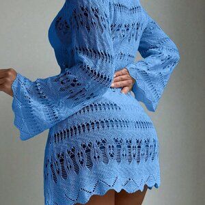 Blue Boho Womens Beach Hollow Out Scallop Trim Cover Up Dress Without Bikini Set