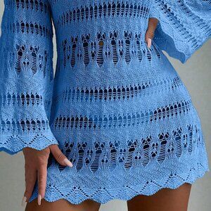 Blue Boho Womens Beach Hollow Out Scallop Trim Cover Up Dress Without Bikini Set