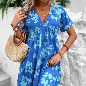 Blue Boho Women's Floral Print Batwing Sleeve Ruffle Hem Smock Dress
