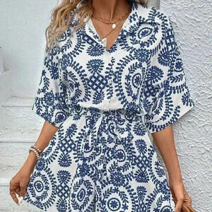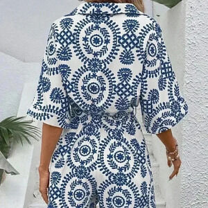 Blue Boho Women's Summer Beach Floral Printed Shirt Jumpsuit Shorts