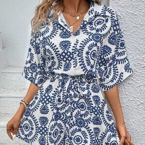 Blue Boho Women's Summer Beach Floral Printed Shirt Jumpsuit Shorts