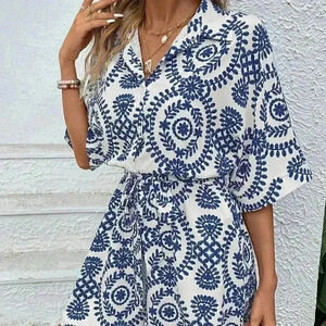 Blue Boho Women's Summer Beach Floral Printed Shirt Jumpsuit Shorts