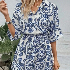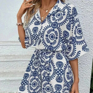 Blue Boho Women's Summer Beach Floral Printed Shirt Jumpsuit Shorts