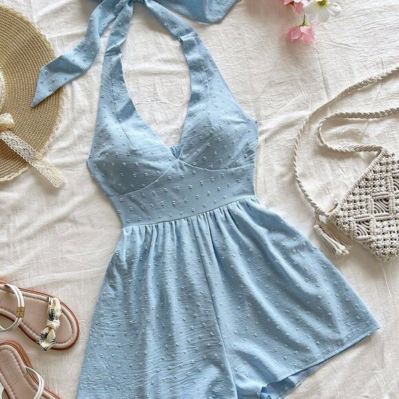 Blue Boho Women's Textured swiss dot halter Romper Vacation