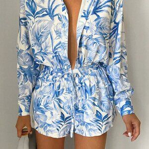 Blue Boho Women's Vacation Floral Print Long Sleeve Shirt And Shorts Set