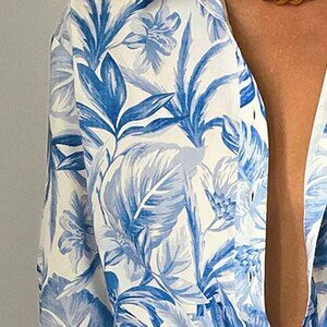 Blue Boho Women's Vacation Floral Print Long Sleeve Shirt And Shorts Set