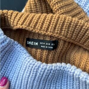 Stay cozy and stylish in this beautiful blue and brown colorblock knit sweater! This oversized sweater features a flattering boat neck design and is perfect for layering during the cooler months.