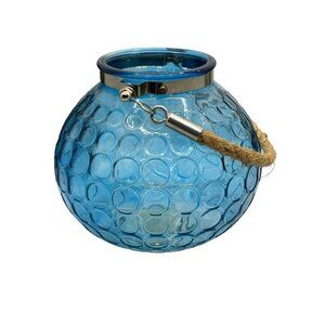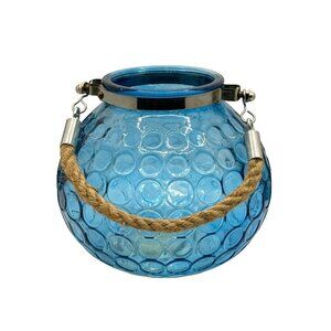 This charming blue bubble glass candle holder adds a touch of coastal elegance to any space. The metal and rope handle make it easy to hang.