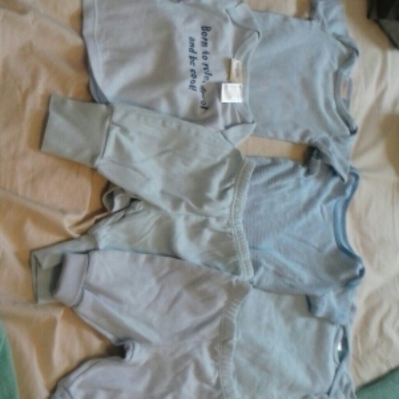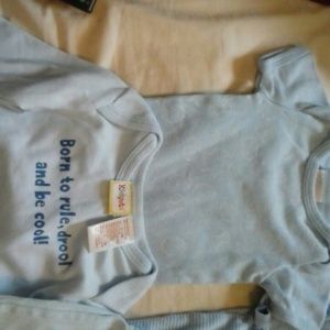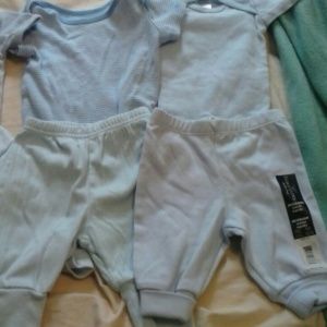 4shirts one plain, one with white strips, and one with white stars,soccer balls,football's, And one long sleeve with born to rule,drool, and be cool. Also two parts of blue cotton pants