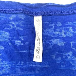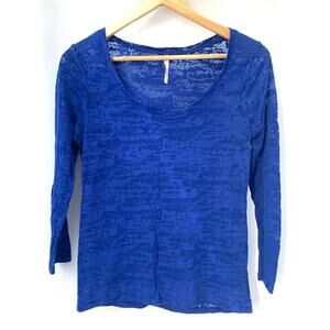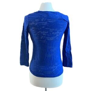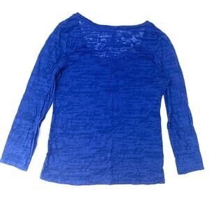 Blue burnout lightweight long sleeve tee shirt, sheer, slightly see through, has some stretch, displayed on size medium (8-10) dress form, gently worn overall good condition