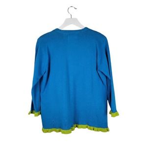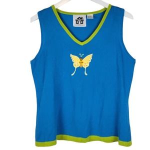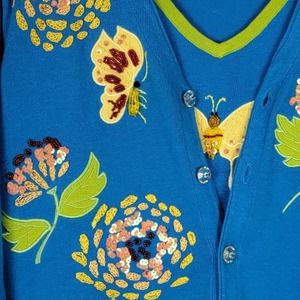 This vibrant blue sweater features beautiful butterfly embellishments, perfect for adding a touch of whimsy to your wardrobe. The intricate design is complemented by a comfortable fit, making it ideal for any casual outing.