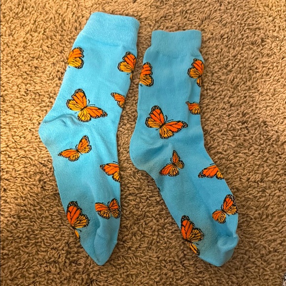 Add a touch of whimsy to your wardrobe with these blue socks featuring a vibrant butterfly pattern. Perfect for everyday wear.