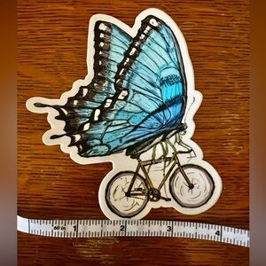 Add a whimsical touch to your space with this blue butterfly in a bicycle sticker. Perfect for vehicles, bikes, laptops, water bottles or anything you want to put a sticker on.