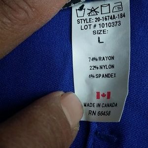 This Elastic waists stretches to 16 inches, and no more. No lining, and non-functioning decorative only buttons.Strong thick material. Infrequently worn, excellent condition. Machine washable