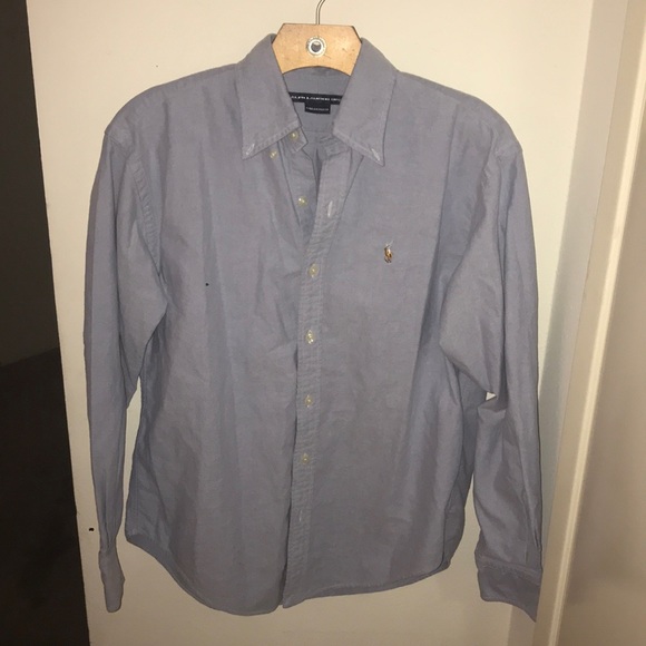 Chambray Ralph Lauren button down long sleeve polo. Small, color blocked embroidered logo.